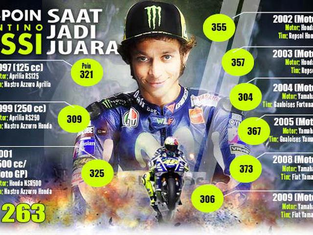 Sebab Rossi sebenarnya hanya berharap bisa menang dan menjadi juara dunia tanpa memikirkan berapa kali prestasinya akan terulang. Sembilan gelar juara dunia itu meliputi gelar juara dari kelas 125cc 1997 250cc 1999 dan tujuh kali dari kelas utama MotoGP atau 500cc 2001-2005 2008-2009. Tiga gelar di antaranya didapat Rossi saat berkiprah di kelas 125cc 250cc dan 500cc.